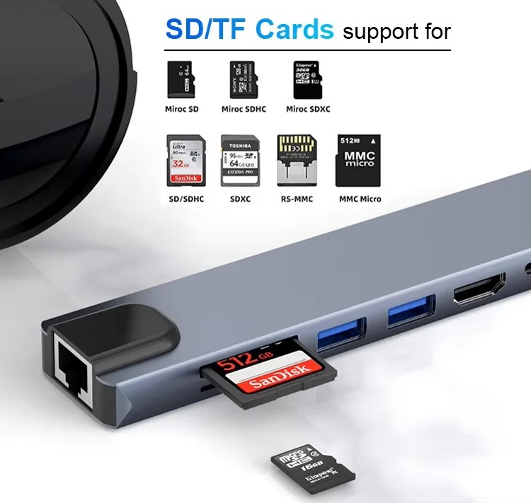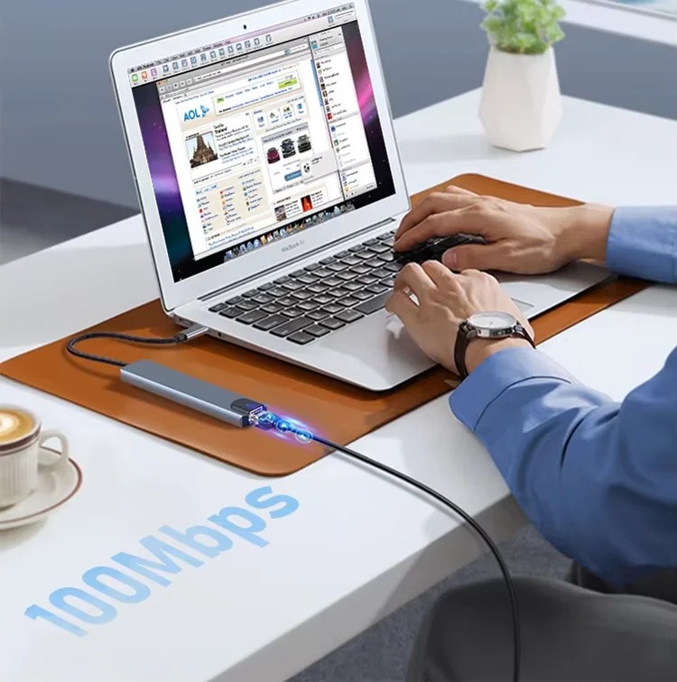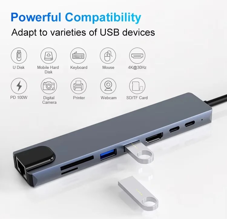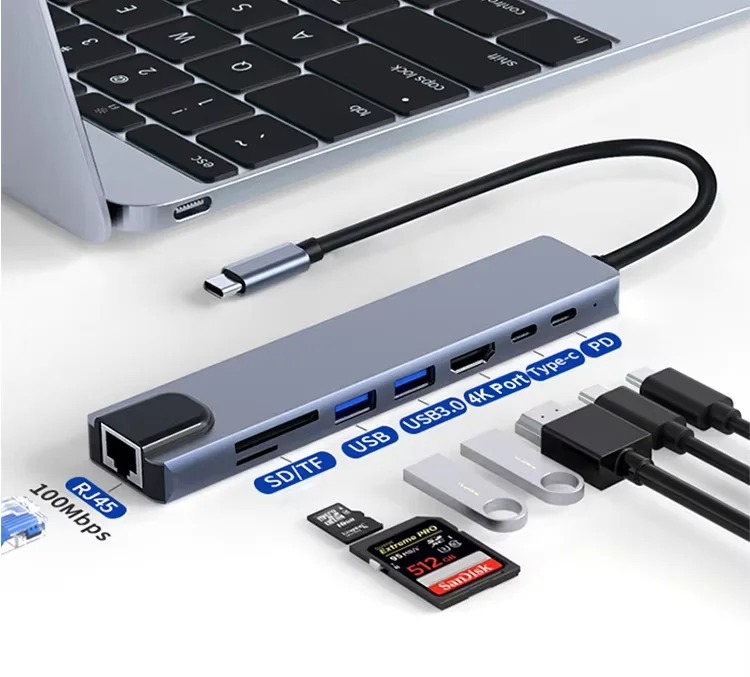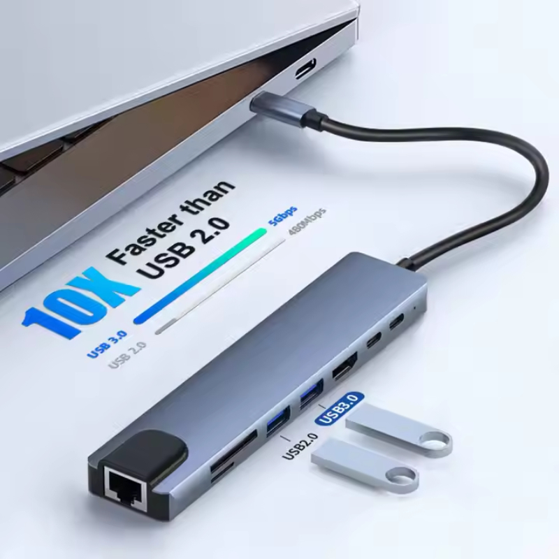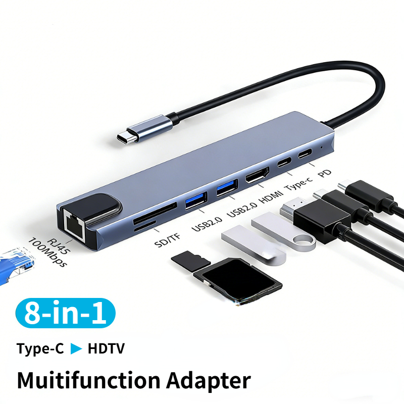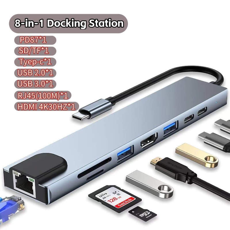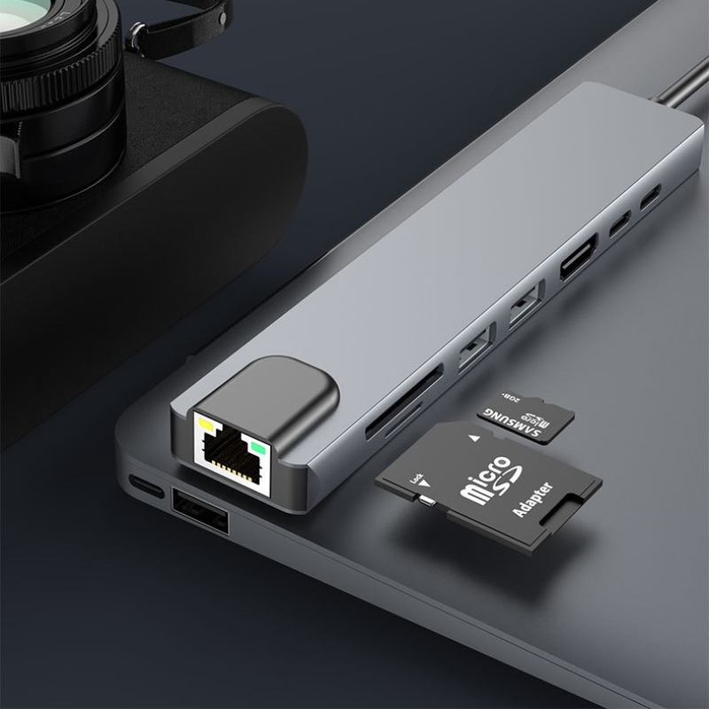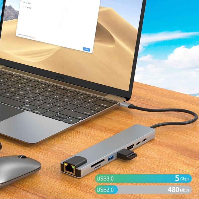 ពង្រីកលំហការងាររបស់អ្នកភ្លាមៗជាមួយឧបករណ៍ Docking Station Type-C 8-ក្នុង-1។ បង្កើតឡើងសម្រាប់អ្នកប្រើប្រាស់ដែលត្រូវការសមត្ថភាពខ្ពស់ ឧបករណ៍នេះបំប្លែងរន្ធតែមួយទៅជាមជ្ឈមណ្ឌលតភ្ជាប់ដ៏មានថាមពល រួមមាន 4K HDMI, អ៊ីនធឺណិត RJ45 ថេរ និងការសាកថ្មល្បឿនលឿន 100W PD។