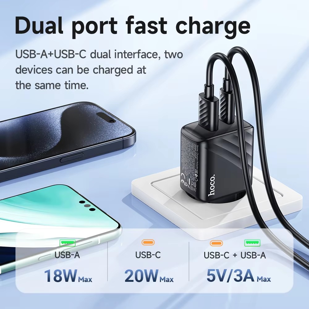The HOCO CS25A 20W USB Type-C Charger is a compact fast-charging adapter that supports PD and QC 3.0 protocols, making it ideal for quickly powering iPhone 15/14/13/12 series and iPads. With reliable build quality and efficient performance, it delivers up to 20W output for safe and speedy charging on the go.