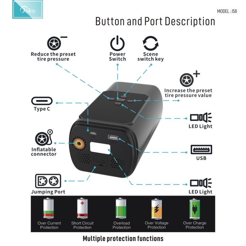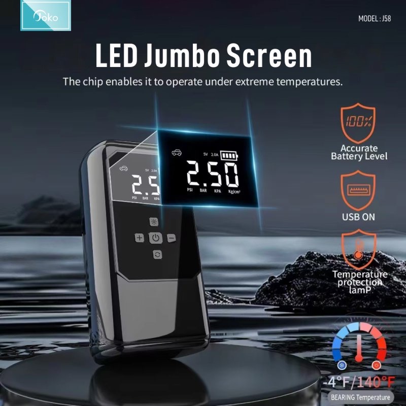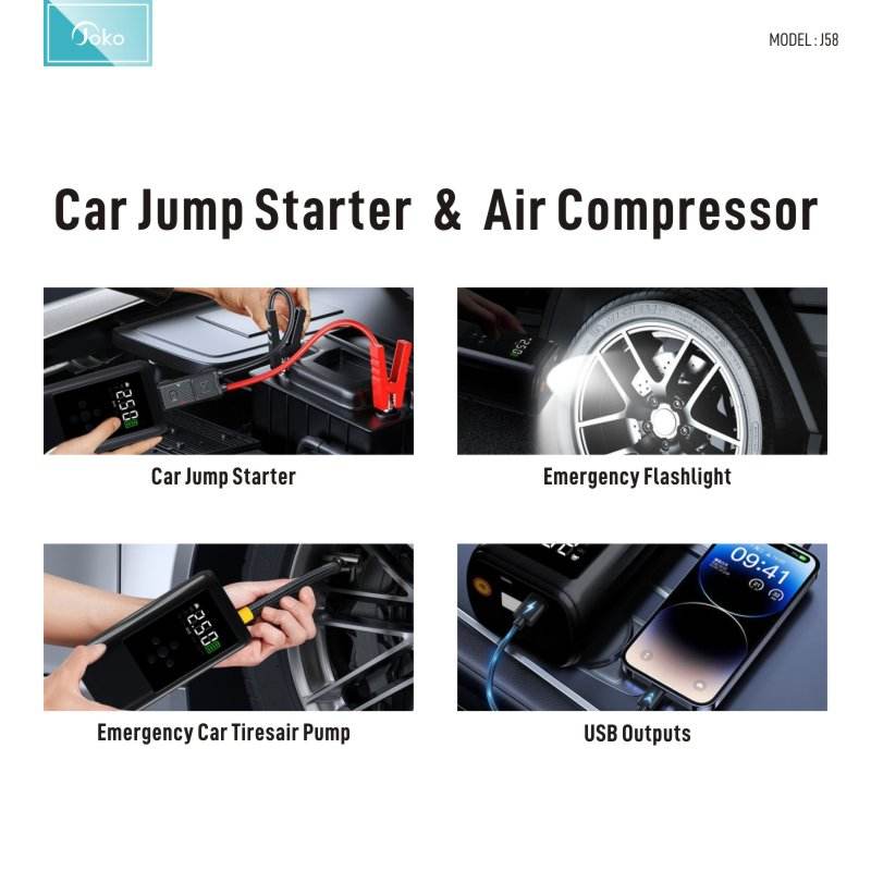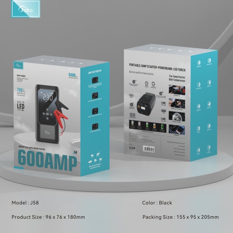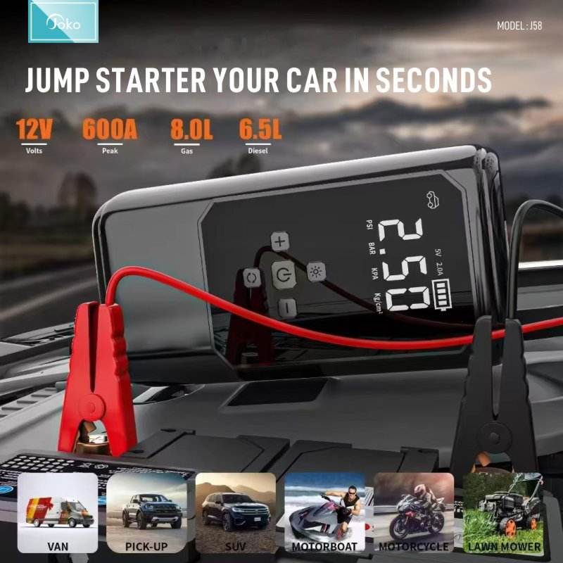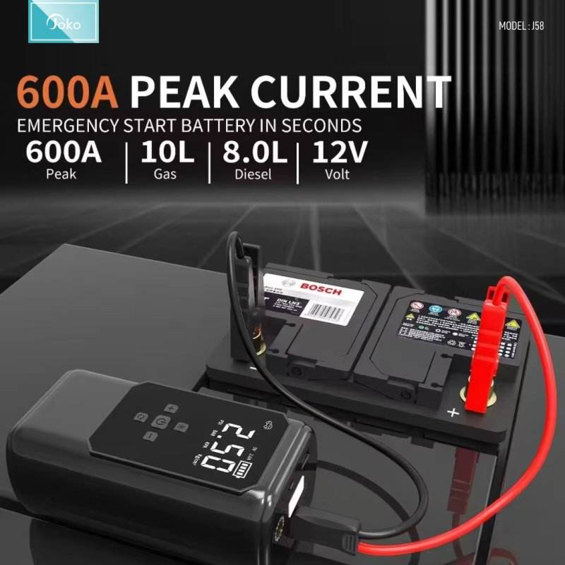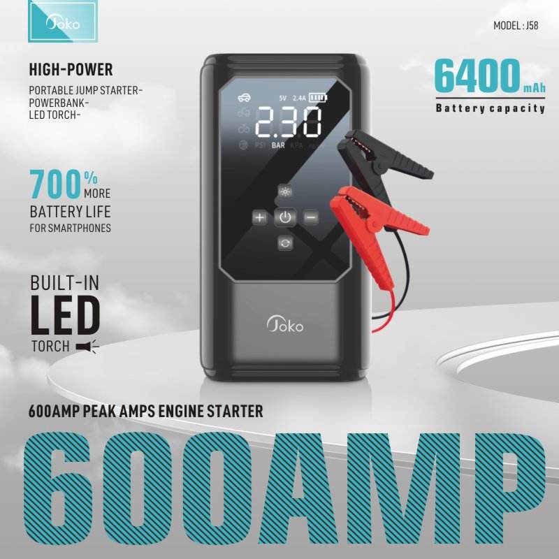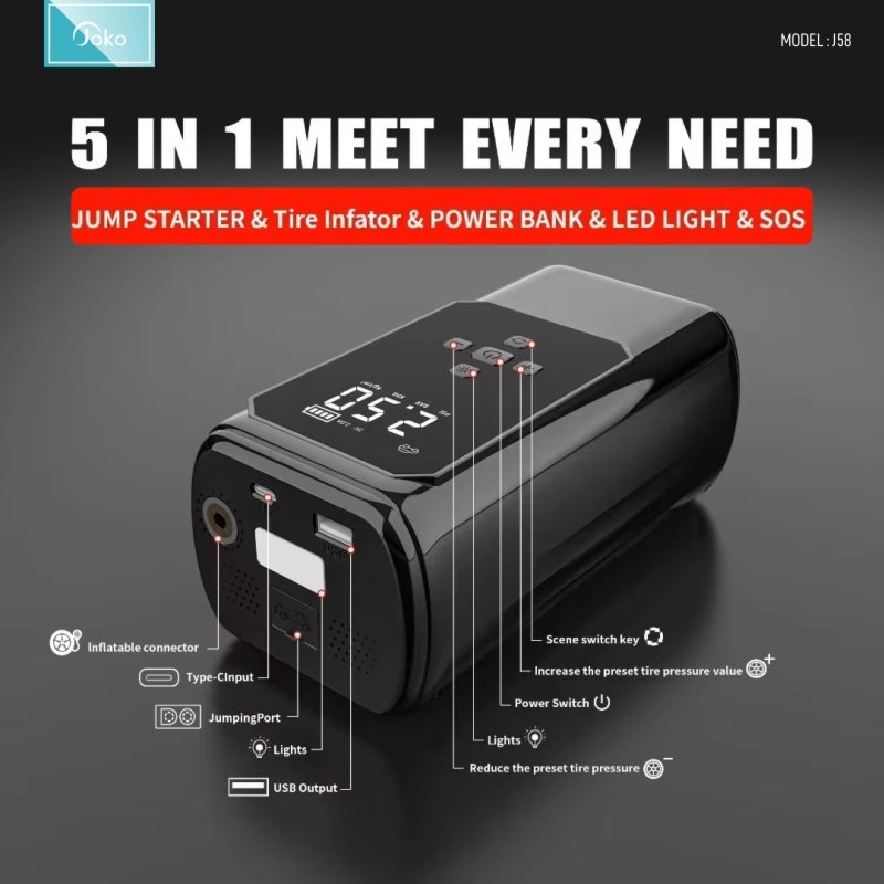 JOKO J58 គឺជាជំនួយការដ៏សំខាន់បំផុតដែលអ្នកបើកបរគ្រប់រូបគួរមានជាប់តាមឡាន។ ទោះបីវាមានរូបរាងតូចល្មម តែវាមានសមត្ថភាពអាច កូវឡានបានដល់ 600A និងមាន ម៉ាស៊ីនសប់កង់ជាប់ក្នុងខ្លួន ដែលអាចសប់បានដល់ 150 PSI។ លើសពីនេះ វាដើរតួជា Power Bank សាកលឿន 22.5W និងមាន ពិល LED ដែលមានមុខងារ SOS សម្រាប់ដាក់ជាសញ្ញាប្រាប់ឡានពីក្រោយនៅពេលមានបញ្ហា។ វាត្រូវបានផលិតឡើងយ៉ាងរឹងមាំ ជាមួយបច្ចេកវិទ្យាស្នូល ២២ ស៊ីឡាំង ធានាភាពជឿជាក់រាល់ពេលប្រើប្រាស់។