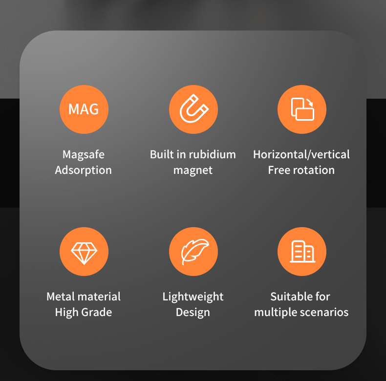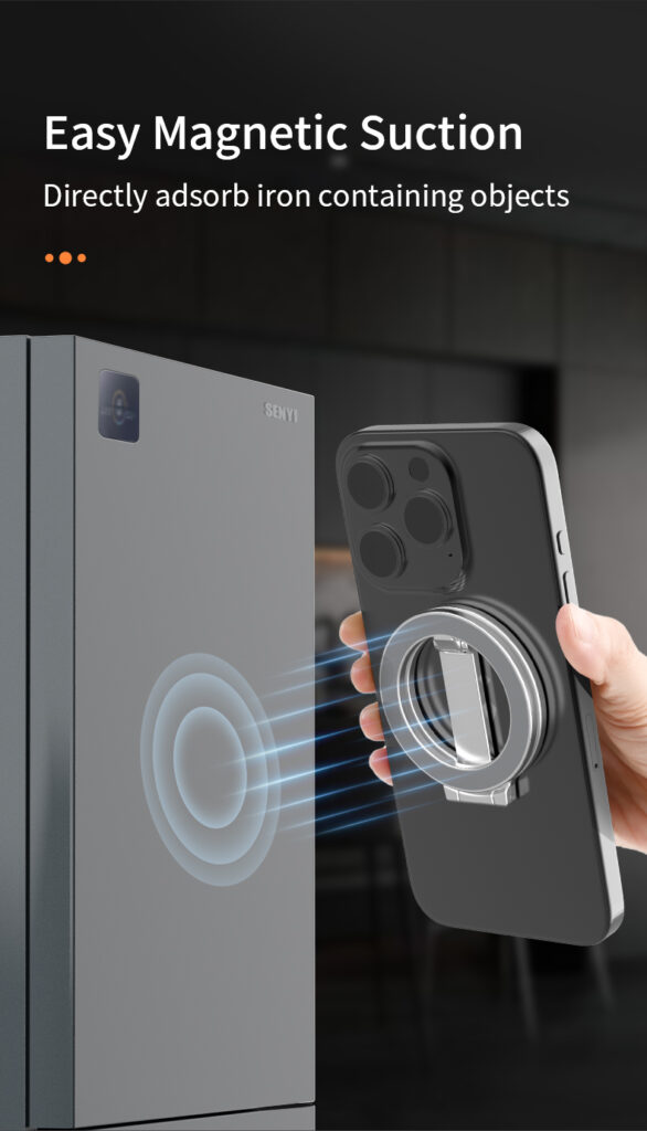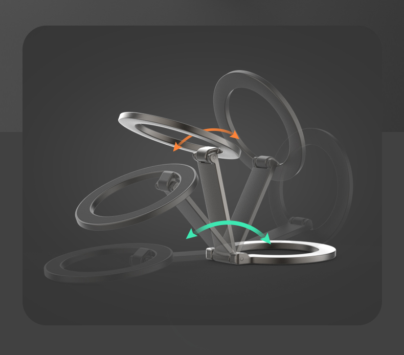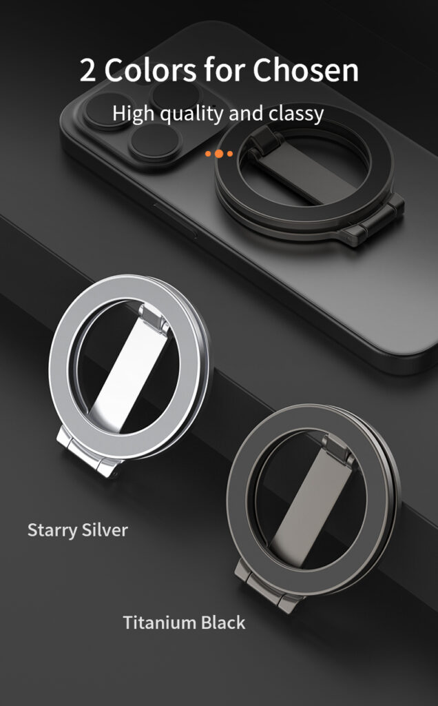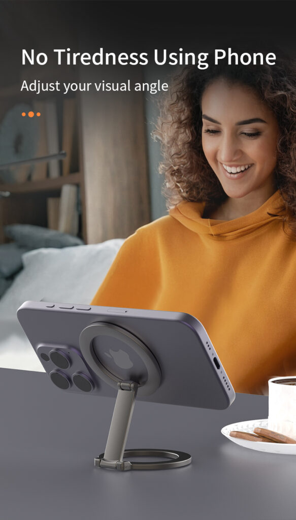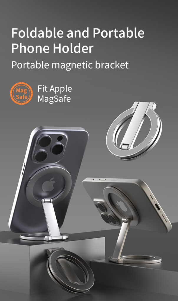 ទទួលបានភាពងាយស្រួលដោយមិនបាច់កាន់ទូរស័ព្ទជាមួយ ជើងទម្រទូរស័ព្ទម៉ាញ៉េទិចសងខាងប្រភេទបត់។ បង្កើតឡើងដោយកម្លាំងម៉ាញ៉េទិចទាំងសងខាង ឧបករណ៍នេះមិនត្រឹមតែចាប់ទូរស័ព្ទអ្នកឱ្យជាប់ប៉ុណ្ណោះទេ ប៉ុន្តែវាថែមទាំងអាចបិទជាប់នឹងផ្ទៃលោហៈនានា ដូចជាម៉ាស៊ីនរត់ក្នុងក្លឹបហាត់ប្រាណ ឬតាប្លូឡាន។ ជាមួយនឹង សមត្ថភាពបង្វិល ៣៦០ ដឺក្រេ និង ការរចនាអាចបត់បាន វាជាដៃគូដ៏ល្អបំផុតសម្រាប់ការធ្វើដំណើរ។ វាគាំទ្រទាំង iPhone MagSafe និងទូរស័ព្ទ Android គ្រប់ម៉ូឌែល (ដោយប្រើសន្លឹកម៉ាញ៉េទិចដែលមានស្រាប់ក្នុងប្រអប់)។
